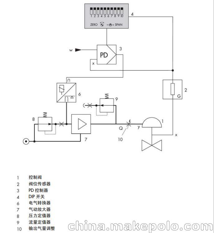 3730-0 型電氣閥門定位器作為氣動(dòng)控制 閥的重要附屬裝置,裝配到氣動(dòng)控制閥并 用于按輸入控制信號將閥位準(zhǔn)確定位。由 控制系統(tǒng)或控制器來的直流輸入控制信 號作為給定值 w, 閥位作為被調(diào)參數(shù)和反 饋量 x,閥門定位器將兩者進(jìn)行比較,進(jìn)而 按一定規(guī)律輸出信號 y 給氣動(dòng)執(zhí)行器調(diào)節(jié) 閥位。 要求的供氣壓力在 1.4 到 6 巴之間。作為 參考變量的電流輸入信號應(yīng)在 4 到 20mA。 定位器可以直接裝配在 3277 型執(zhí)行器 上,或符合 IEC60534-6(NAMUR)標(biāo)準(zhǔn) 裝配到相應(yīng)的執(zhí)行器上。每種方式都有相 應(yīng)的安裝件。 3730-0 型定位器主要由閥位傳感器(閥 位—電阻線性轉(zhuǎn)換)、模擬量電氣轉(zhuǎn)換器 和氣動(dòng)放大器以及模擬控制器等部件組成。